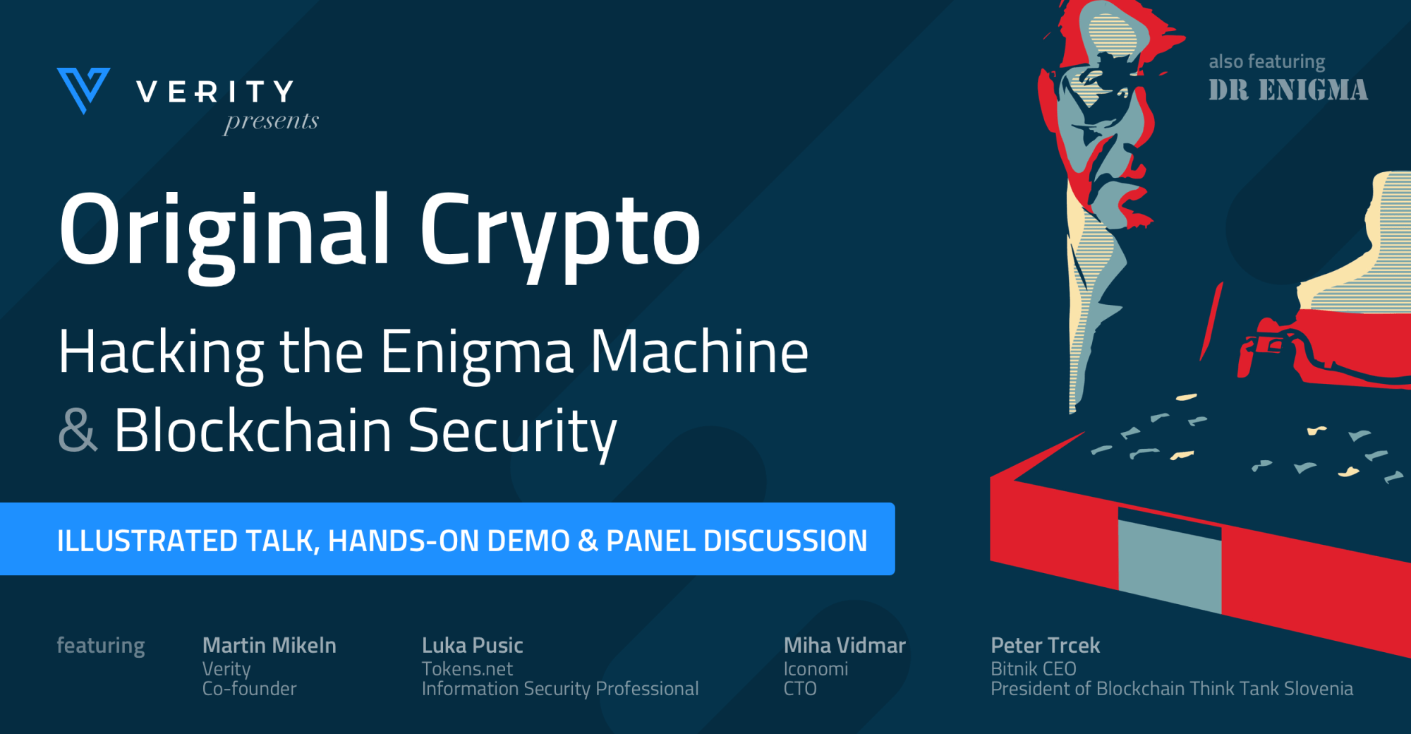 Last week, upon the invitation of blockchain company Verity – Dr Enigma travelled to Slovenia’s beautiful capital to present at the ‘Original Crypto’ evening as well as visit Verity’s office and speak to both the Slovene media and Verity staff about the Enigma machine.