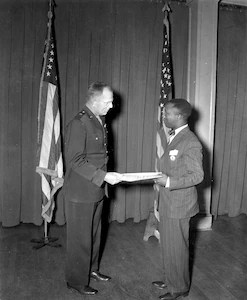 William D Coffee receiving an official award for cryptographic work from General Preston Corderman.